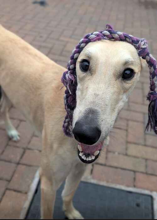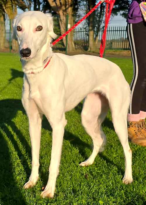 Stella is one of our quirkier girls, apparently, she doesn't have the spark people are looking for, and as such still hasn't had anyone interested in her. When she knows you, she is an affectionate girl who will give paw and hold on to your hand, she enjoys her walks and walks nicely on the lead. She isn't keen on all dogs but does show an interest in similar breeds and has been known to have a little play with a fellow sighthound. Being a stray, we don't know what Stella has been through, but it has taught her to be wary of new people, she takes a while to trust and would like a quiet home with patient people due to this, she would prefer not to live with any children. If you think you could be the one to see what others don't, please pop in to meet our Stella, or phone for more information.