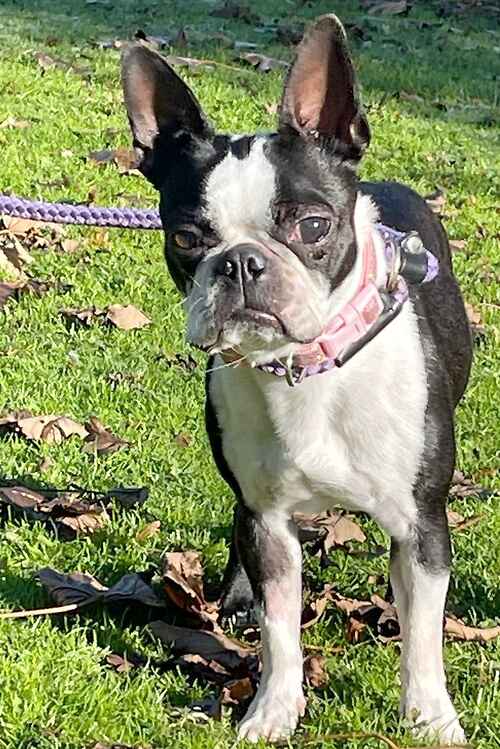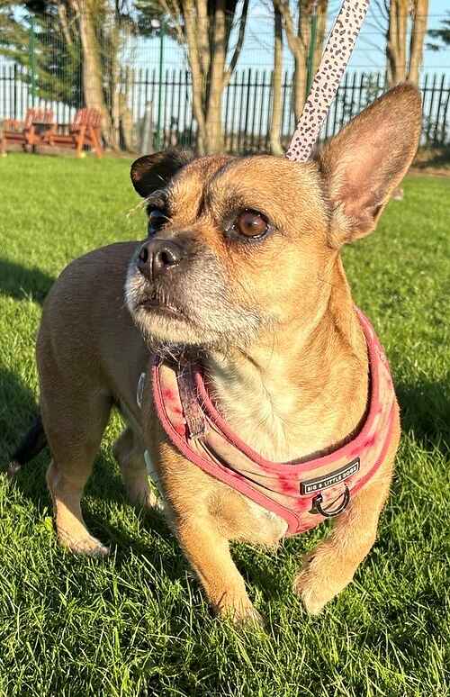 Olivia is truly one of a kind, she will be an amazing companion in the right home, with experienced people who understand what makes her tick. She is a funny, affectionate girl who loves a bum scratch and chasing leaves, on her terms, she loves a cuddle and having a fuss made of her. She is sociable with most dogs and has had many dog friends here at Last Chance, she would however be best as the only pet in her new home. Being a stray, we don't know what Olivia has been through, but whatever it is, has led her to be very protective of 'her' things. She is known to guard her toys and food bowl, along with seemingly random items, due to this she is needing a very experienced home where she can work on this behaviour. Here at Last Chance she loves to go on long walks with our volunteers and enjoys running through the long grass, she would love an active home where she can show you just how fast a frenchie can be. If you think you have the experience and love Olivia needs, please contact us for more information.