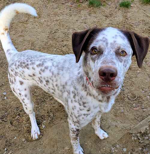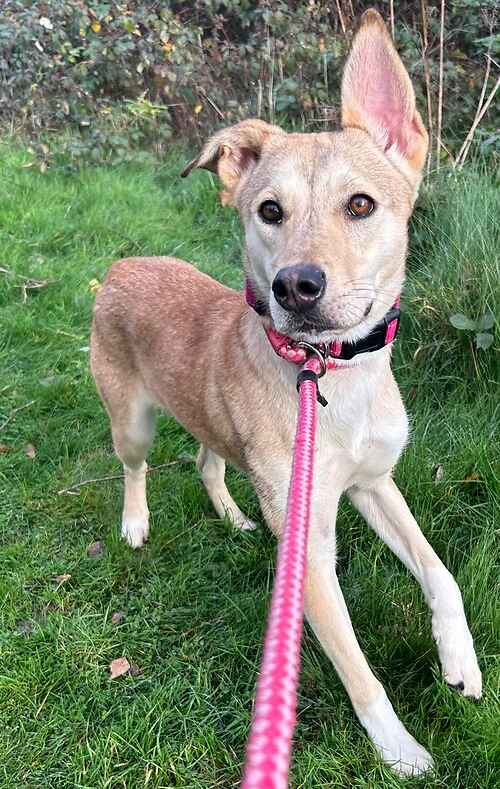 Our lovable goofball Rocco is dreaming of people with hearts as big as he is. Weighing over 40kg, there is a lot of Rocco to love, but due to this he will be needing a home with people who are used to bigger dogs. He has lots of energy, and loves nothing more than exploring on long walks, or bouncing around with a ball. He is sociable with other dogs, however doesn't have the best manners and other dogs struggle to understand him, he would benefit from further socialising to help him with this. Rocco is a smart boy, and under all his goofiness he knows sit, paw, down and wait, being only young he would love people who can teach him more. He does have a very high prey drive so would not be able to live with any small animals, he also has springs for back legs and so will need a very secure garden to play in. If you are ready for a dog who comes with oodles of fun and love, please contact us for more information, or pop in to meet him.