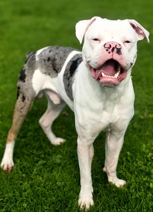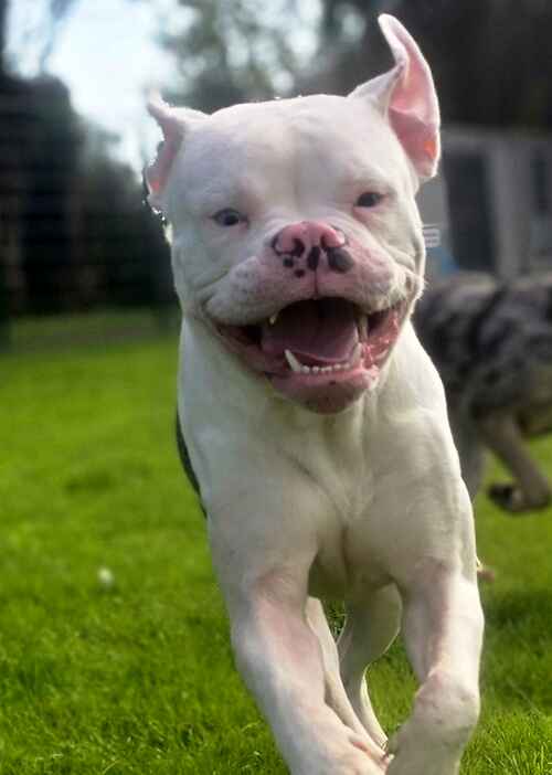 Penelope sadly came to Last Chance as an unclaimed stray. Smelly and covered in fleas Penelope had obviously come from an unloved place. We believed whoever had her before coming to Last Chance had tried to use her as a guard dog/ status dog due to her breed however upon spending time with Penelope it’s clear to see she would of been useless at this as she is a happy friendly girl who loves everyone she meets which could of resulting in her being thrown out like rubbish. Penelope has had little to no socialisation and training. She has absolutely no manners and thinks the words no, wait, stay mean yes let’s go play! Penelope loves being around people and will get frustrated when she knows you are about to leave her however a few games of fetch has her calmed down. Penelope absolutely loves toys and loves finding new ones to take back to her with her. Sadly due to having no socialising Penelope is not good with other dogs we are hopeful that in time with the correct training she would eventually play well with dogs as we think she would enjoy this however we can not say for certain as we don’t know what happened during her puppy years. Penelope would love an active adult only home with no children, dogs or cats. As she has so much energy to burn and would need someone who can put in the time for her.