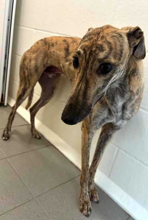 Gabby is lovely girl who can be a little nervous at first. She is an ex racer so has never lived in a home environment before so would love a retirement home with a comfy bed or sofa for her to lounge around in. Gabby loves her walks and loves to lay outside and watch the world go by. She enjoys a gentle fuss and will lean into you for a cuddle. Gabby is starting to show some interest in some of her toys and loves a run around so will need a home with a secure garden of her own where she can run around freely off lead in. Due to Gabby being an ex racer she cannot be homed with cats, small fluffy dogs or small furries. She is ok with dogs of her size. Gabby would need to be muzzled in public due to her high prey drive. Gabby will need a patient and understanding owner who will give her the love and time she needs to settle and show her what it is like to be a pet. If you are interested in this lovely girl please don't hesitate to contact us.